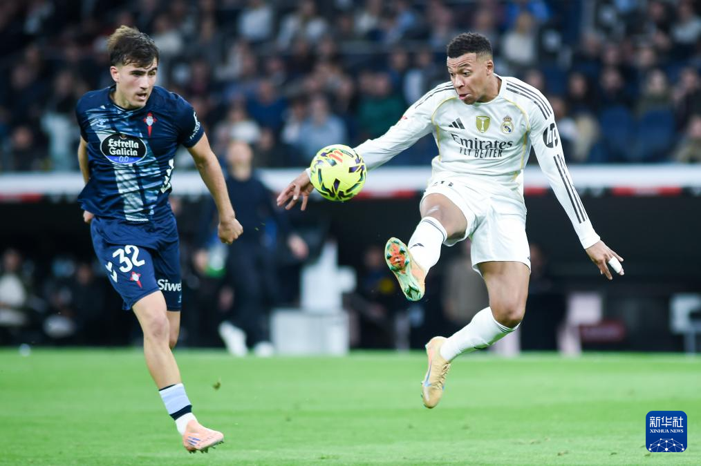 12月7日,皇家马德里队球员姆巴佩(右)和塞尔塔球员哈维·罗德里格斯争抢。