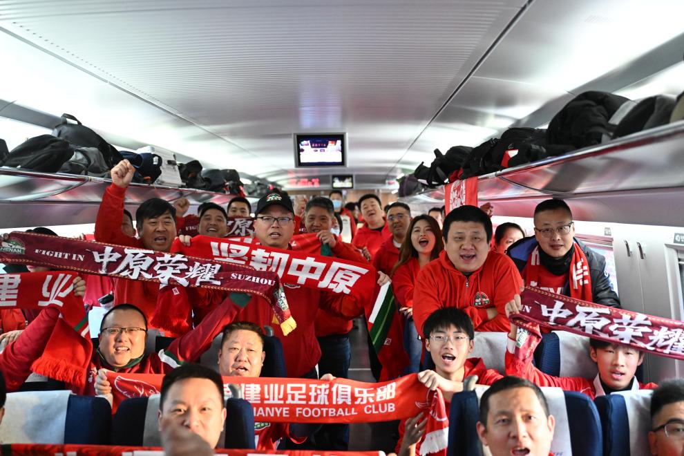 △12月6日,河南队球迷在G1801次列车上为球队加油助威。新华社记者 李嘉南 摄