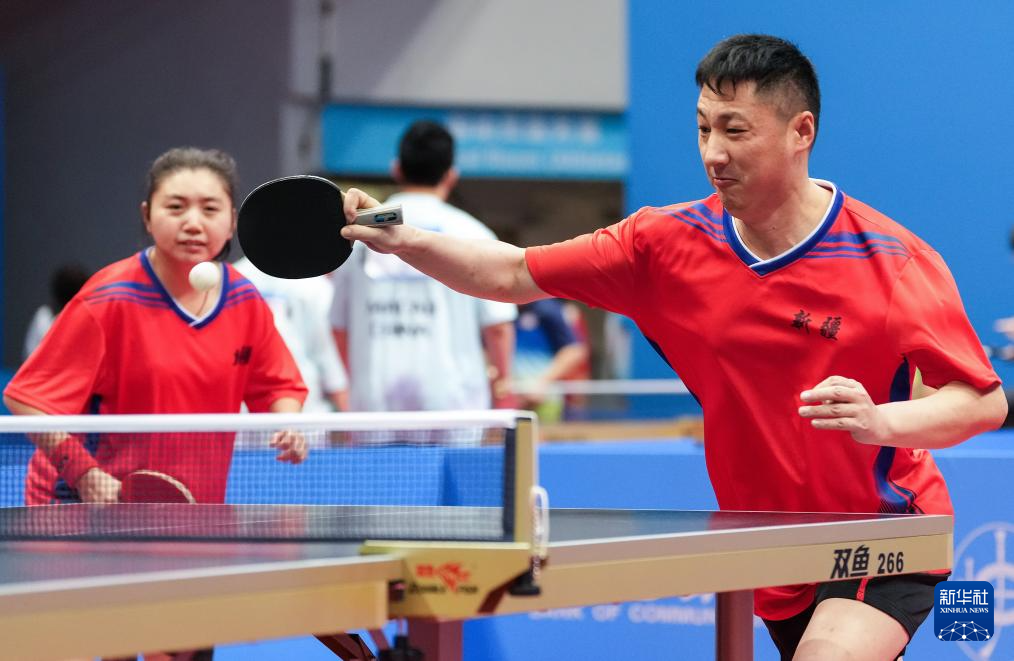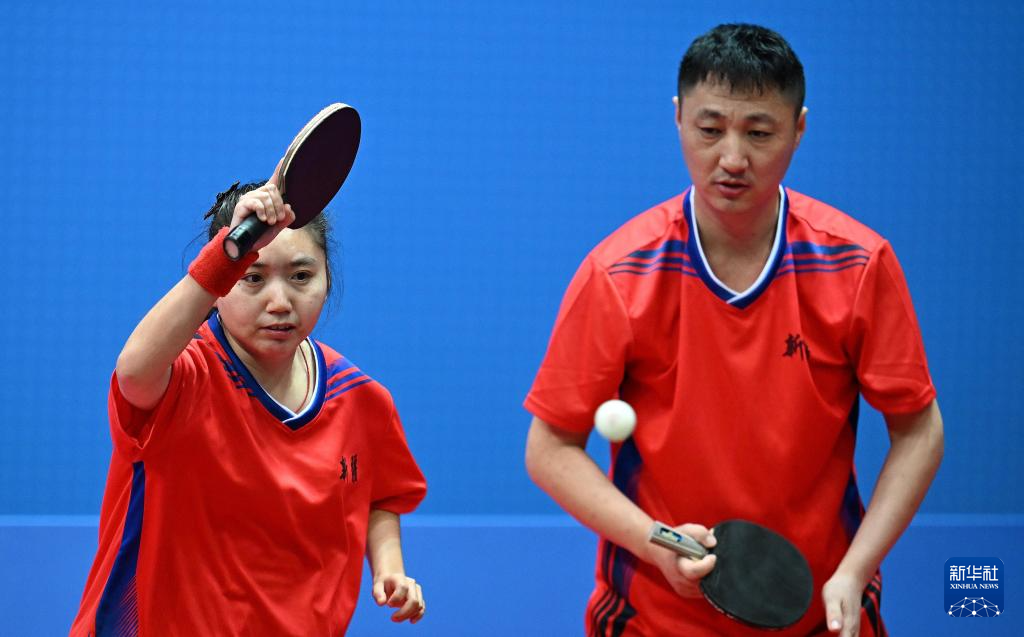 12月8日,新疆队组合王伟(右)/张馨月在与江苏队组合张良忠/夏井兰的比赛中。最终,张良忠/夏井兰获得冠军,王伟/张馨月获得亚军。