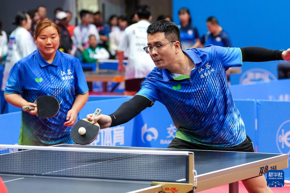 12月8日,江苏队选手张良忠(右)/夏井兰在与新疆队组合王伟/张馨月的比赛中。最终,张良忠/夏井兰获得冠军,王伟/张馨月获得亚军。
