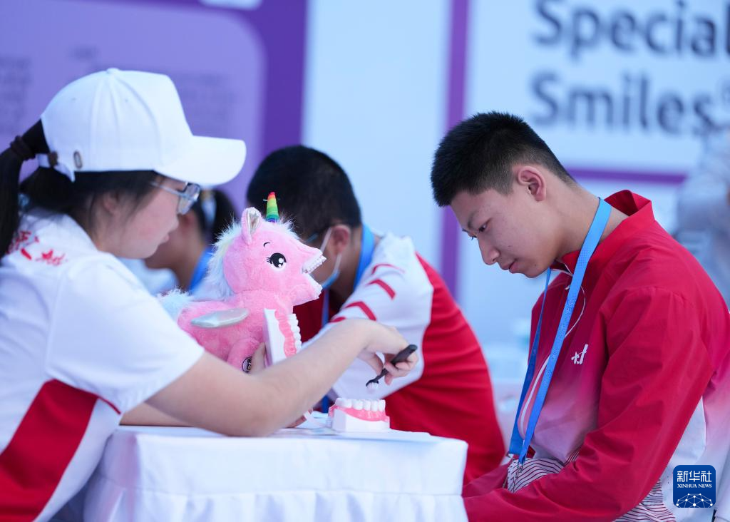 12月8日,在广东省中山市体育馆(副馆),工作人员为特奥运动员普及护齿知识。