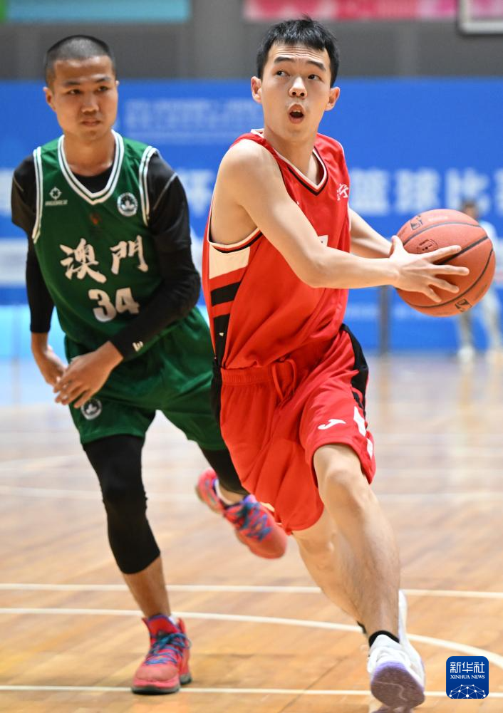 12月9日,澳门一团队球员林卓尧(中)在比赛中带球突破。