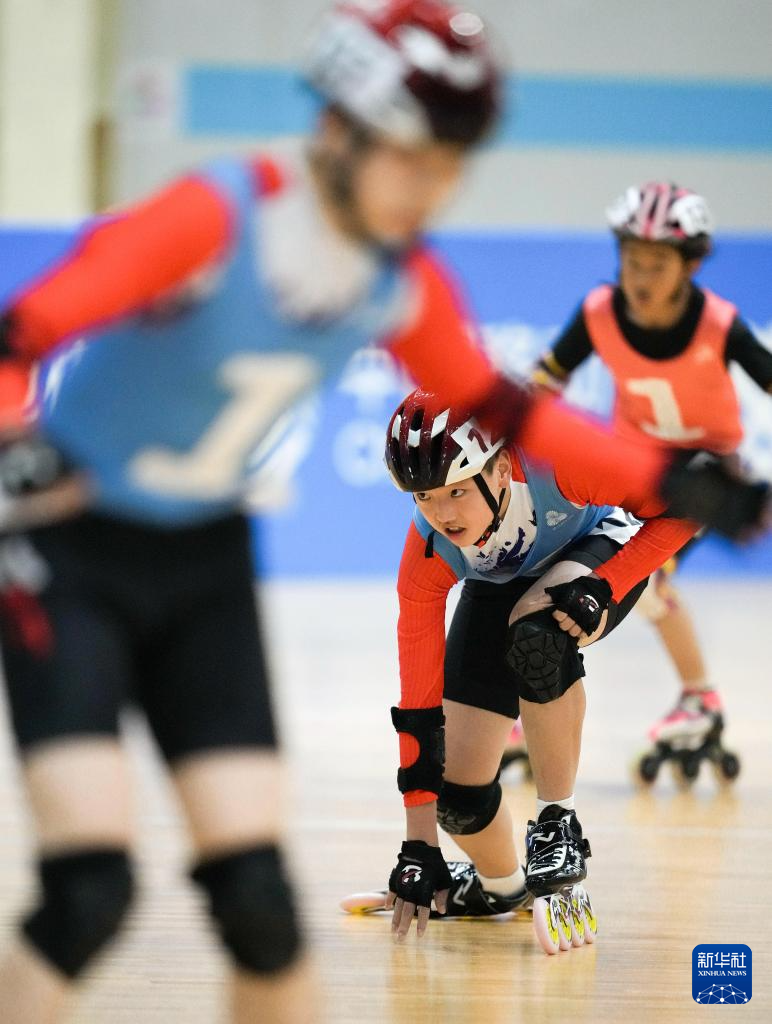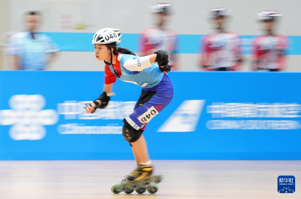 12月10日,黑龙江三队选手吴宛诺在特奥轮滑女子2X200米接力预赛F04组比赛中。
