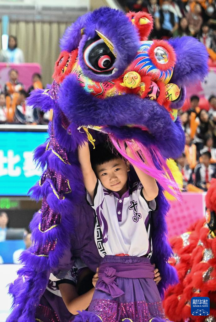 这是12月9日在赛场拍摄的舞狮表演。
