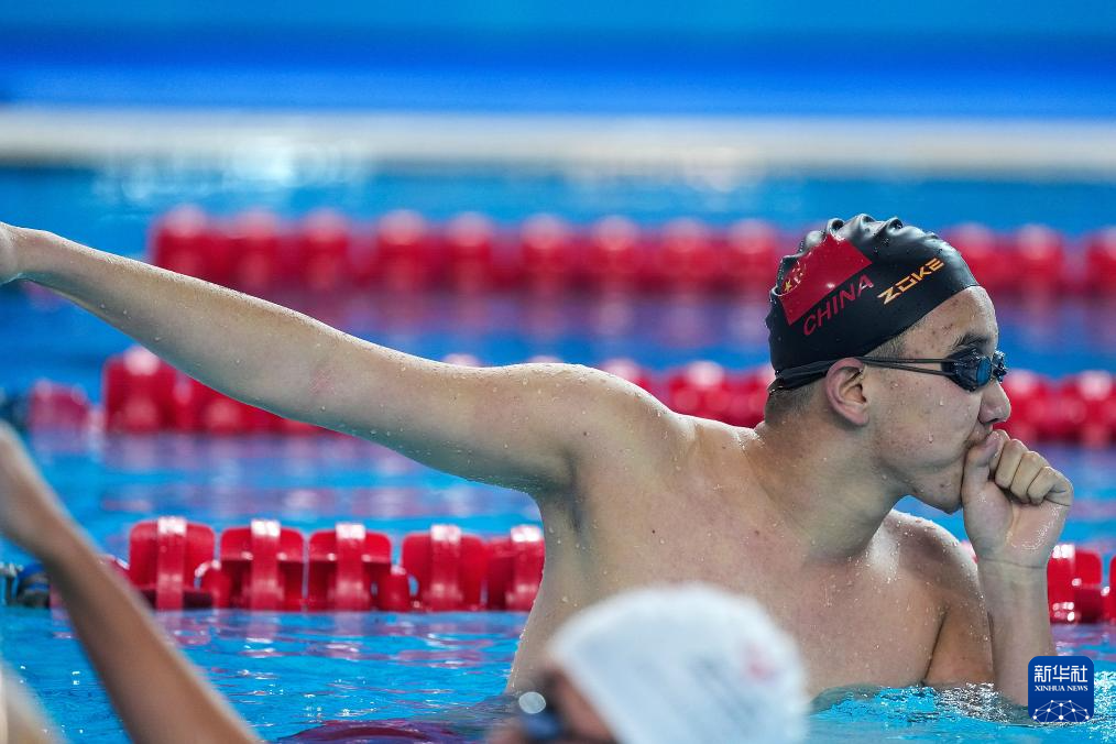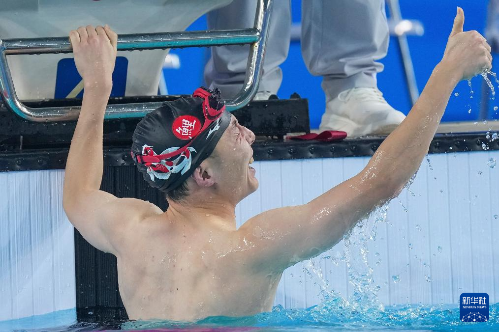 12月10日,内蒙古队选手孙宇亮在男子22-29岁组50米蛙泳预赛结束后庆祝。