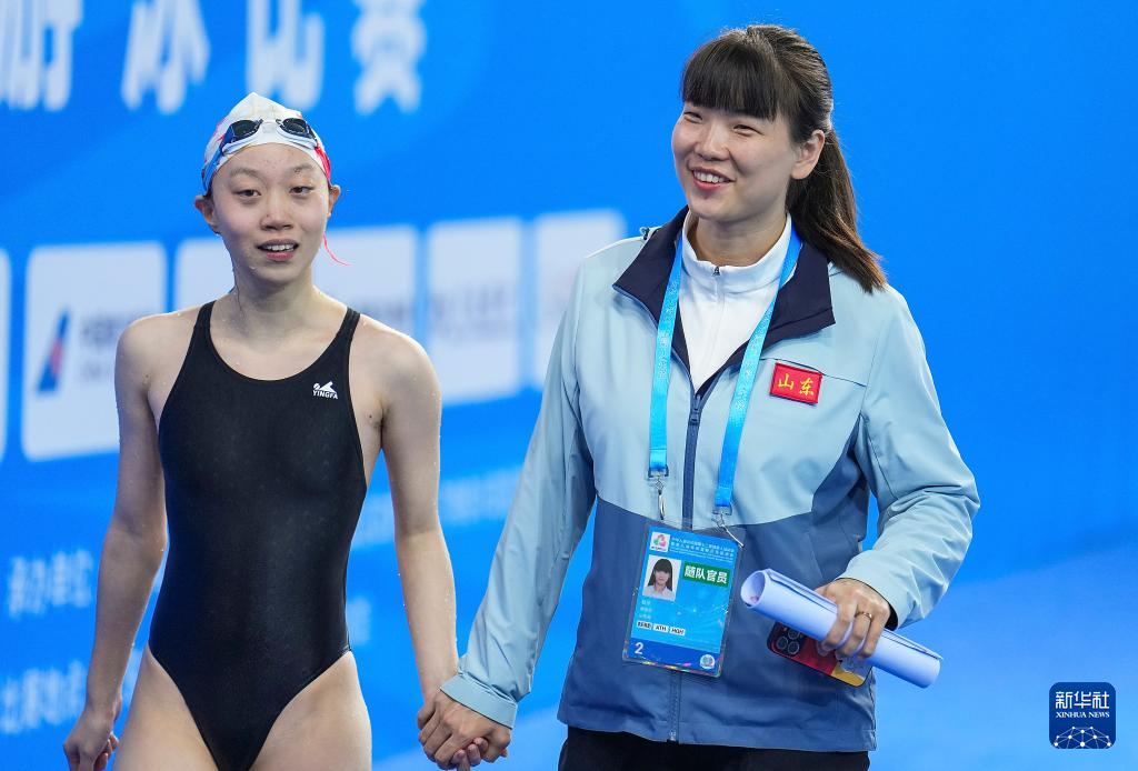 12月10日,山东队选手李敏(左)在女子16-21岁组200米自由泳预赛结束后与教练交流。