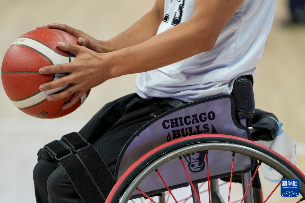 12月9日,西藏队球员塔杰的轮椅侧面贴着美职篮(NBA)芝加哥公牛队的贴纸。塔杰说他的偶像是前芝加哥公牛队球员、NBA名宿迈克尔·乔丹。