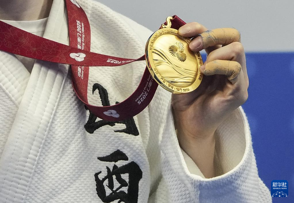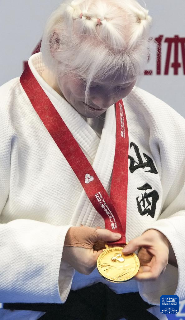12月10日,冠军山西队选手王嘉楠在盲人柔道女子J2-60公斤级比赛颁奖仪式上展示金牌。