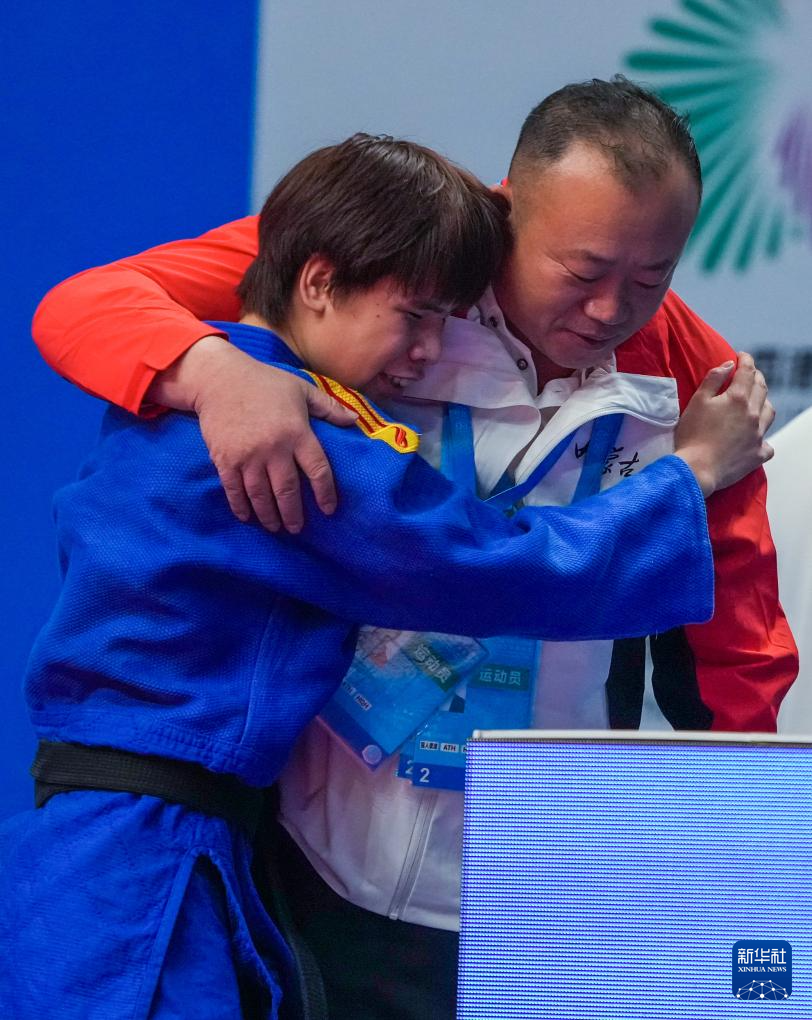12月10日,内蒙古队选手王雨晴(左)在盲人柔道女子J1-60公斤级赛后与教练拥抱。最终,王雨晴获得银牌。