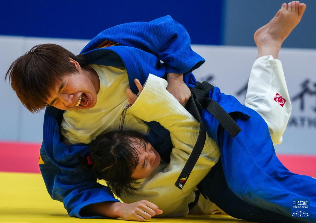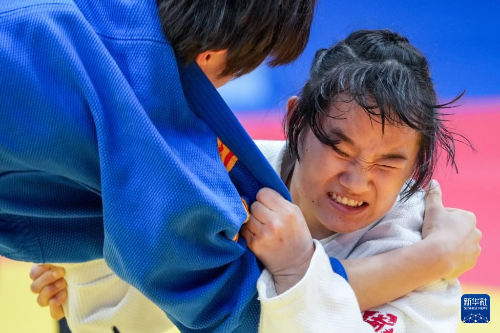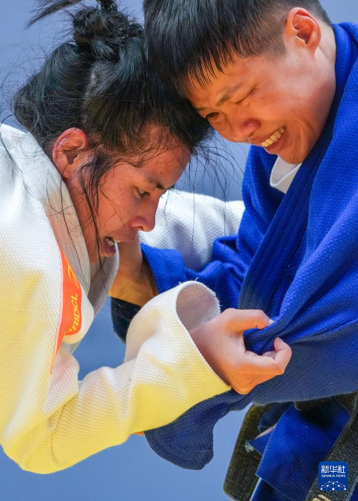 12月10日,内蒙古队选手王雨晴(上)与山西队选手贺雁在盲人柔道女子J1-60公斤级循环赛B组比赛中。最终,王雨晴获得银牌,贺雁获得铜牌。