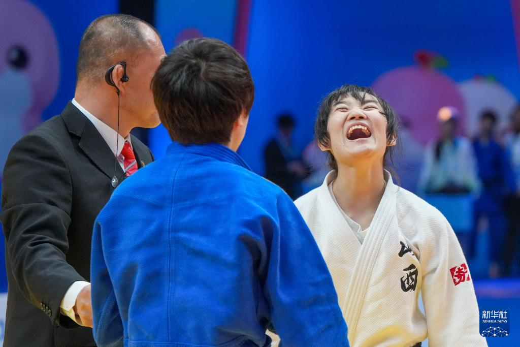 12月10日,山西队选手贺雁(右)在盲人柔道女子J1-60公斤级比赛获得铜牌后呐喊庆祝。