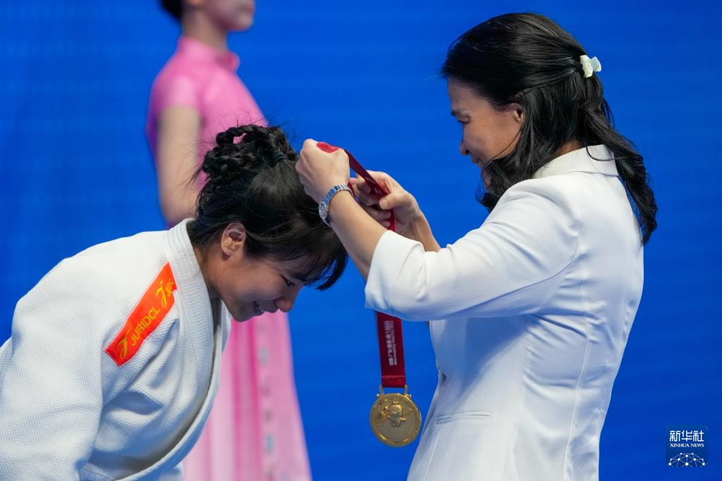 12月10日,冠军山西队选手王嘉楠在盲人柔道女子J2-60公斤级比赛颁奖仪式上抚摸金牌。