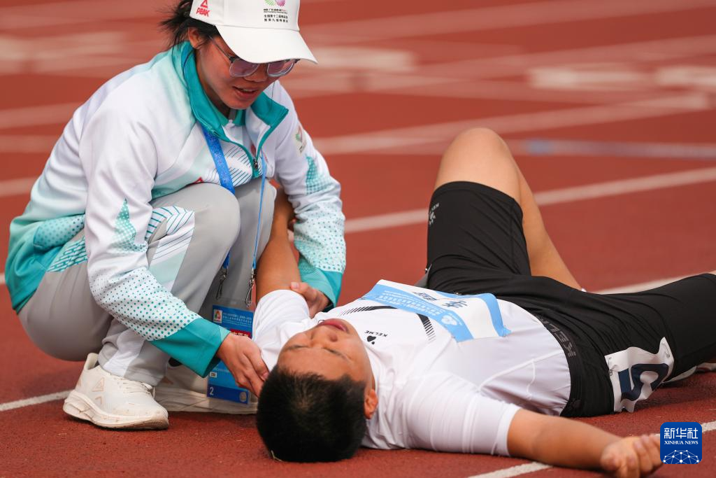 12月11日,志愿者搀扶在男子16-21岁组800米决赛第3组比赛中因体力不支摔倒的四川队选手李超。