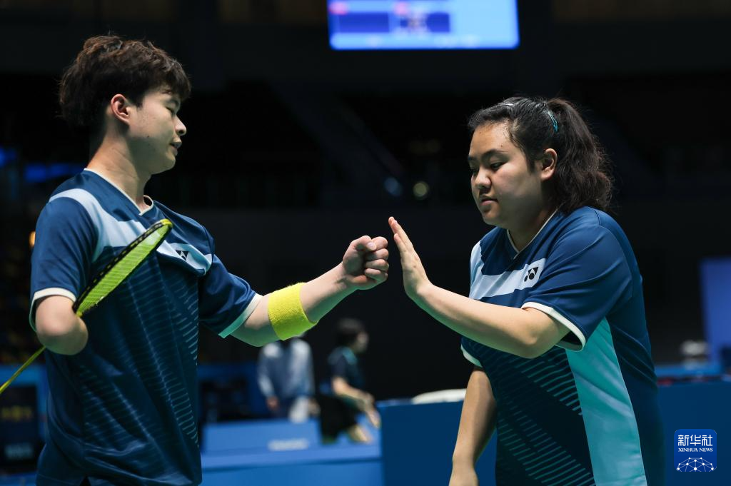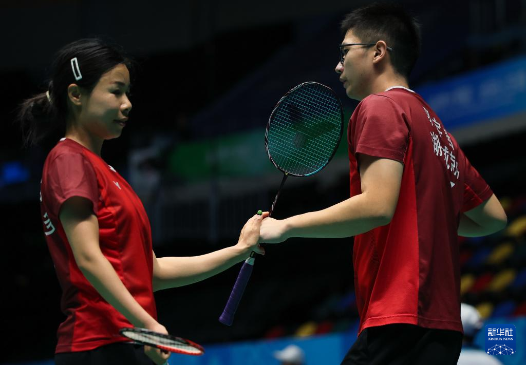 12月10日,湖北队组合赵旭峰/向洛瑾(右)在羽毛球SL3-SU5混合双打1组第2场比赛中。他们0比2不敌四川队组合熊礼川/且沙莫实牛。