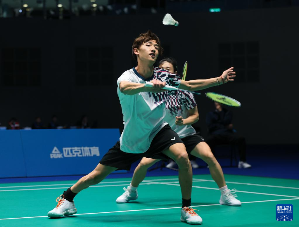 12月10日,贵州队组合李明潘/周志会(右)在羽毛球SL3-SU5混合双打2组第3场比赛中。他们2比0战胜四川队组合颜港/黄紫轩。