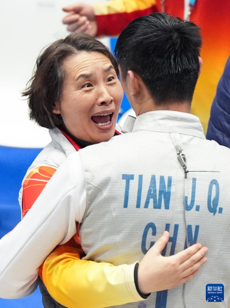 12月12日,江苏队选手田建全(右)与教练在半决赛后庆祝。江苏队45比44战胜上海队,晋级决赛。