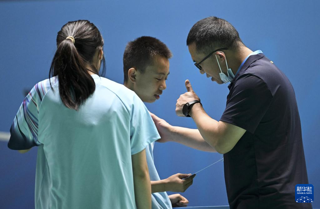 12月11日,安徽队教练刘彦勇(右)在场边鼓励安徽队选手张睿哲。在混合16-21岁组双打E组比赛中,安徽队组合沈晨/张睿哲2比0战胜广东二团队组合石韵希/黄嘉慧。