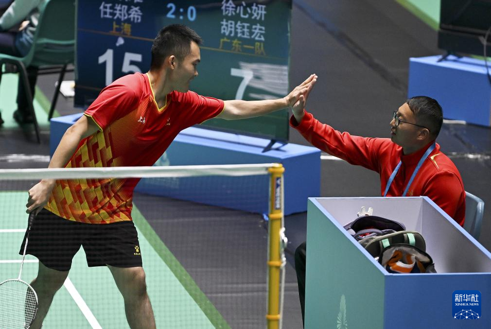 12月11日,上海队选手范欣唯(左)在比赛后和教练击掌。在混合16-21岁组双打D组比赛中,上海队组合范欣唯/任郑希2比0战胜广东一团队组合徐心妍/胡钰宏。
