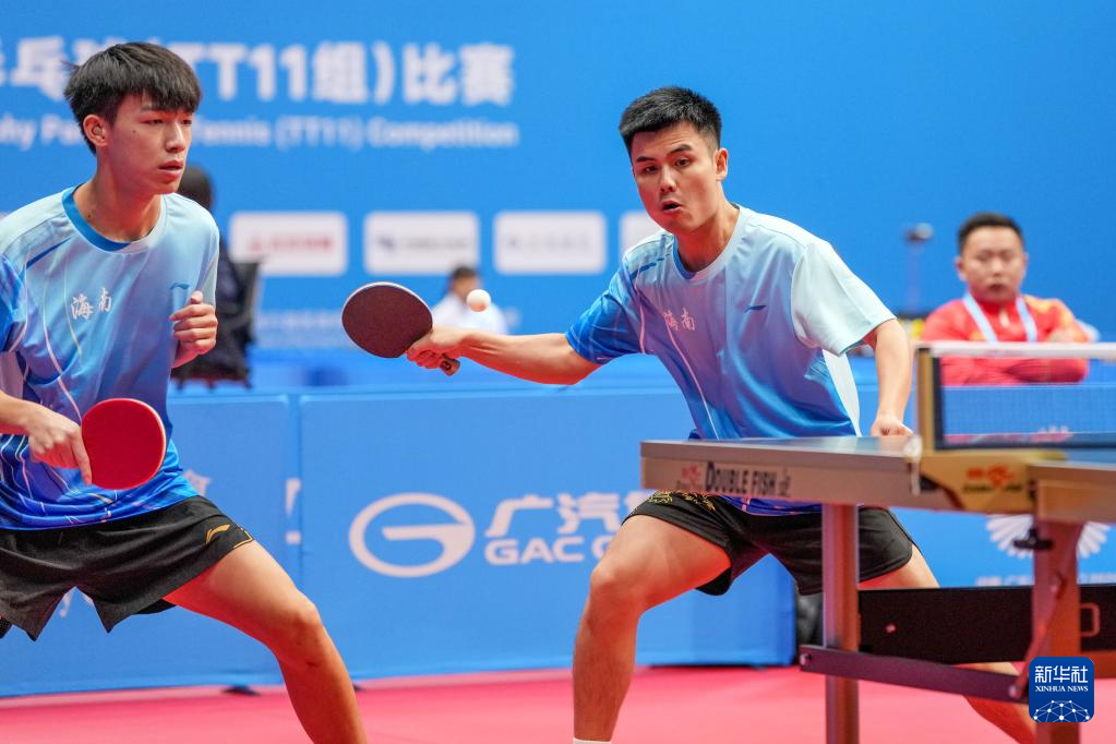 12月11日,海南队组合程濂鸿/张中华(右)在TT11男子双打B组小组赛中。最终,他们3比0战胜香港队组合温伟乐/袁景诚。