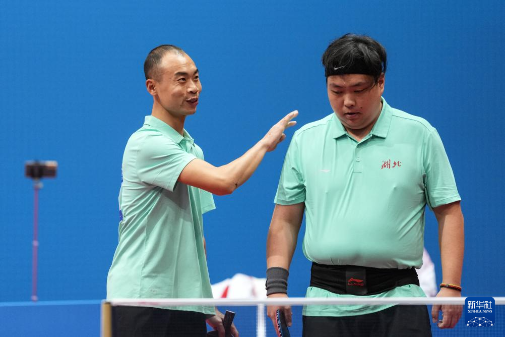 12月11日,湖北队选手王焯(左)在TT11男子双打A组小组赛中安慰队友晏冠英。最终,他们0比3不敌香港二团队组合范嘉豪/梁仲仁。