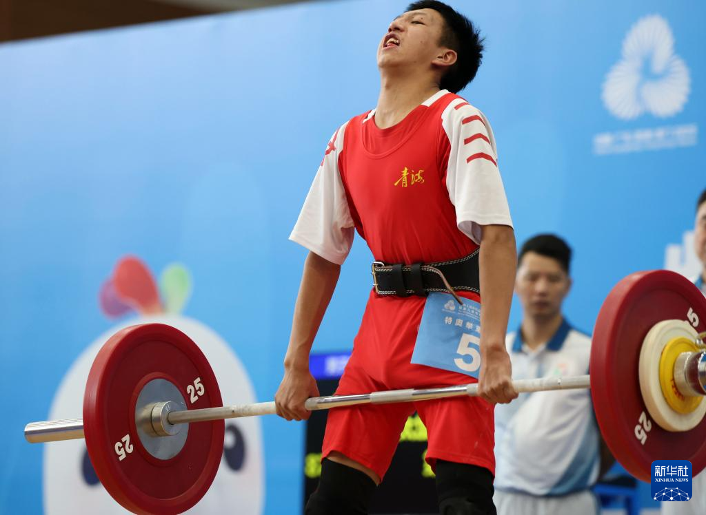 12月12日,青海队选手卡太加在男子16-21岁组56公斤深蹲比赛中。他最终获得该级别冠军。