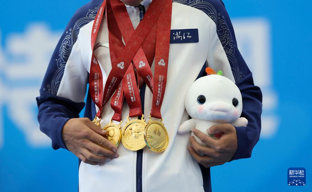 12月12日,浙江队选手陈雷雷在颁奖仪式上抚摸奖牌。他获得男子16-21岁组52公斤深蹲、卧推、提铃、总成绩冠军。