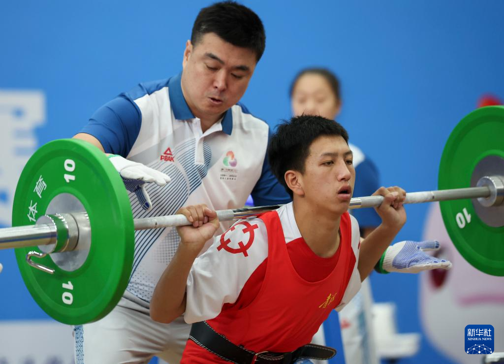 12月12日,青海队选手卡太加在男子16-21岁组56公斤提铃比赛中。他最终获得该级别冠军。