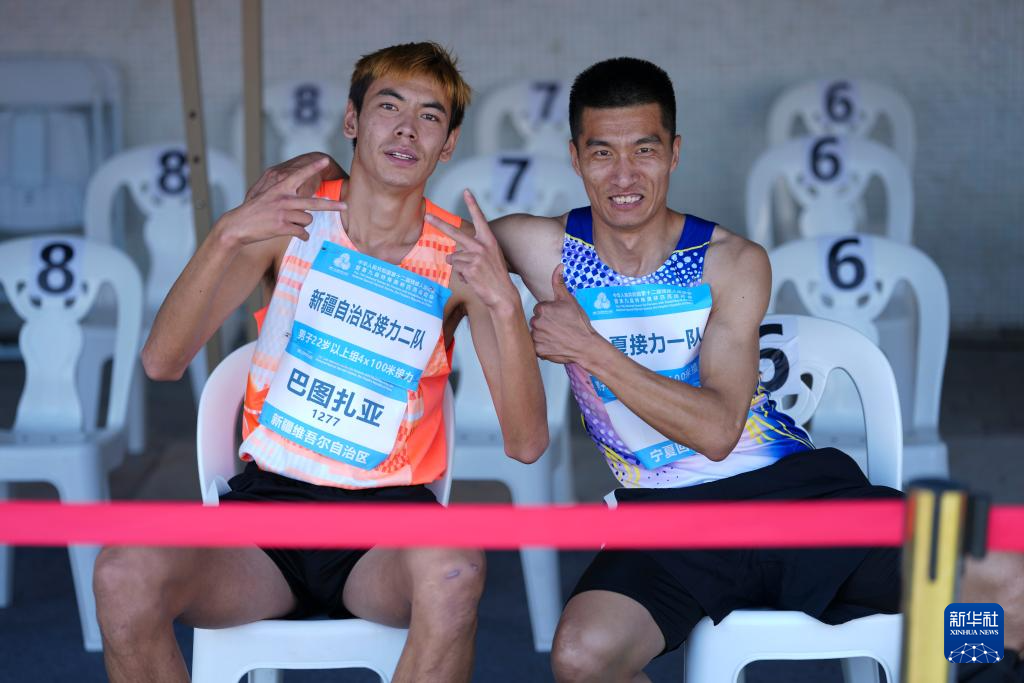 12月12日,在男子30岁以上组4x100米接力决赛后,宁夏接力一队选手吴超(右)和新疆自治区接力二队选手巴图扎亚合影。最终,宁夏接力一队获得冠军,新疆自治区接力二队获得季军。