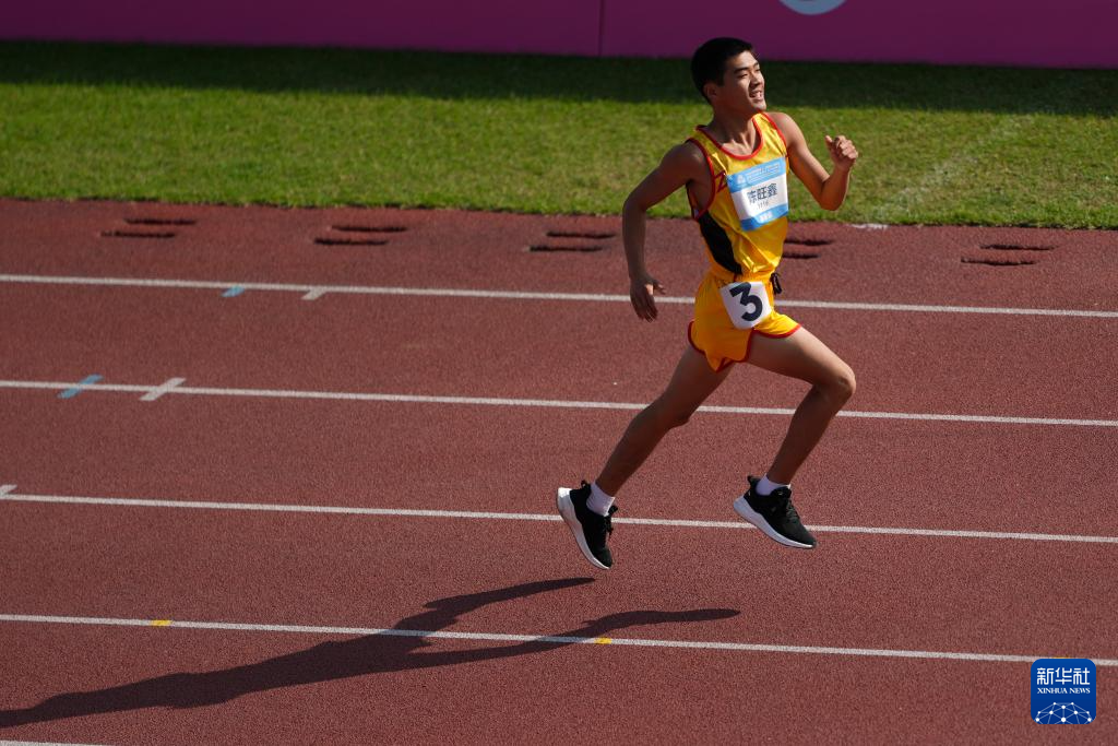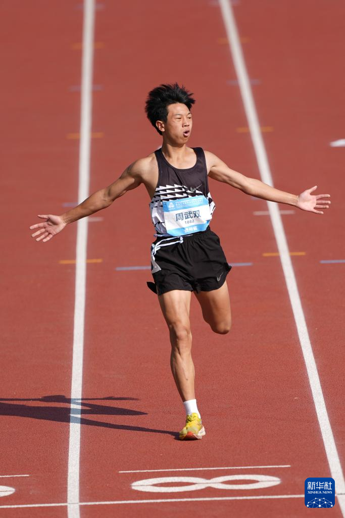 12月12日,贵州队选手周武双在男子12-15岁组400米预赛第4组比赛中,即将冲过终点时庆祝。