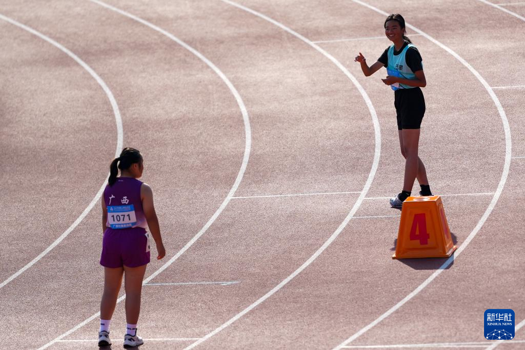 12月12日,在女子12-15岁组400米预赛第3组比赛前,西藏队选手丁增朗增(右)和广西队选手符心田交流。