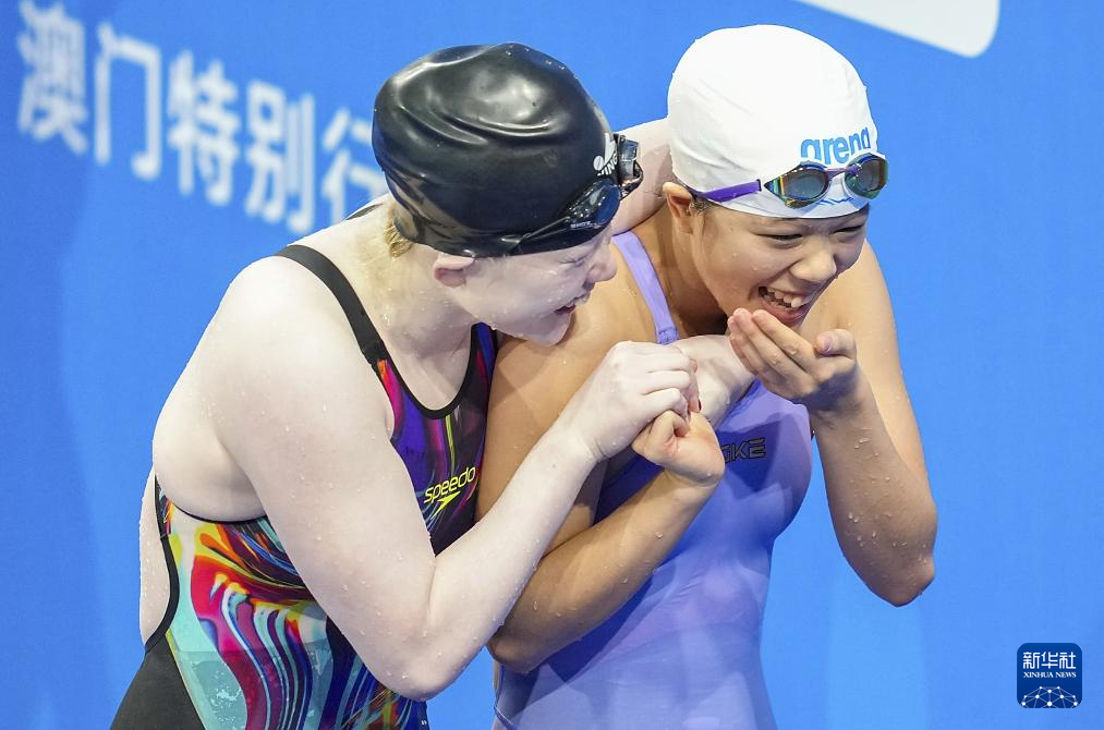 12月11日,广东一团队选手黄健秋(右)与湖南队选手唐宇冰在女子100米蝶泳S13级决赛后庆祝。她们分别获得冠军和亚军。