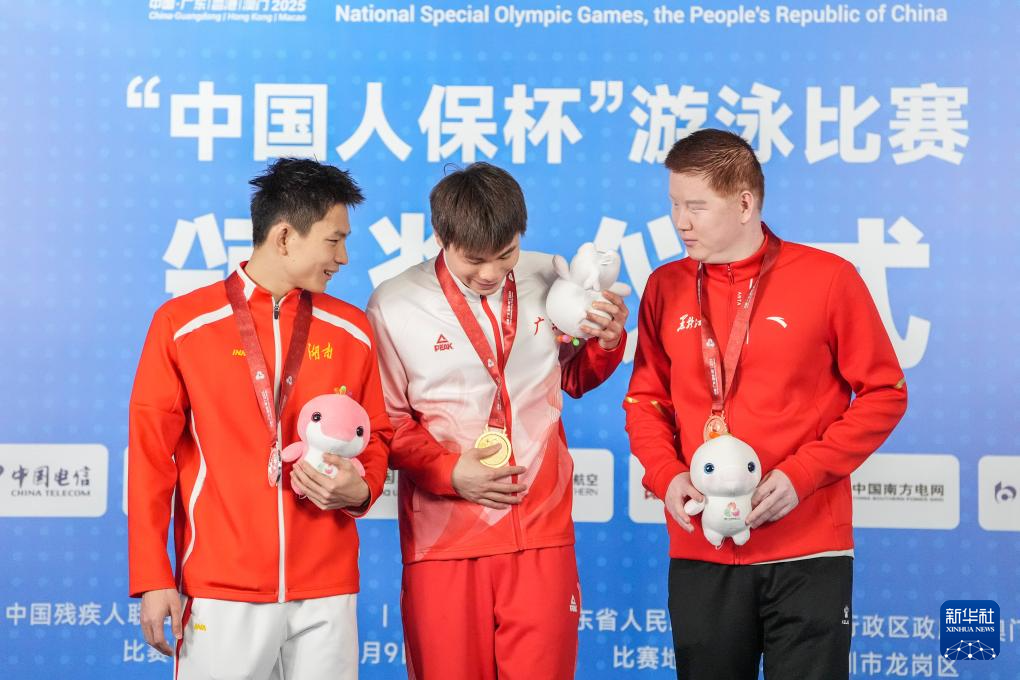 12月11日,冠军广东一团队选手黄学亮(中)、亚军湖南队选手刘鹏思(左)和季军黑龙江队选手孙利龙在男子50米自由泳S13级颁奖仪式上。