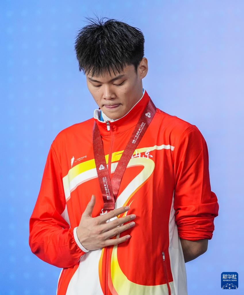 12月11日,亚军山东队选手刘宗辉在男子100米蝶泳S9级颁奖仪式上抚摸奖牌。