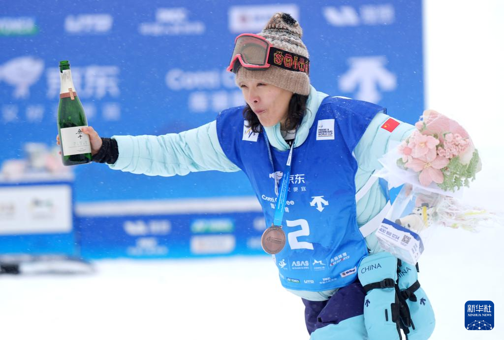 12月12日,季军中国选手蔡雪桐在颁奖仪式上庆祝。