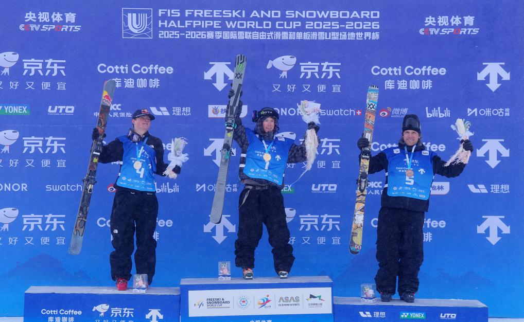 12月13日,冠军新西兰选手梅尔维尔(中)、新西兰选手卢克·哈罗德(左)、季军美国选手亨特·赫斯在颁奖仪式上庆祝。