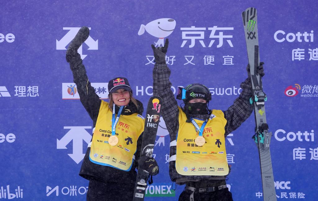 12月13日,女子组冠军中国选手谷爱凌(左)和男子组冠军新西兰选手梅尔维尔在颁奖仪式上合影。