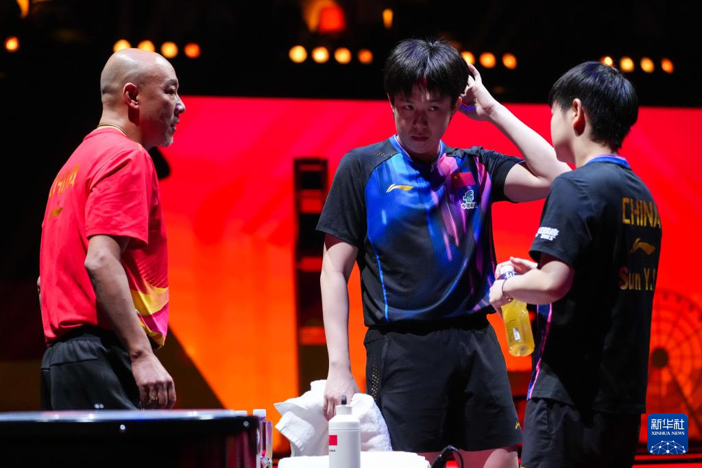 12月12日,中国队教练肖战(左)在比赛暂停时指导王楚钦(中)/孙颖莎。