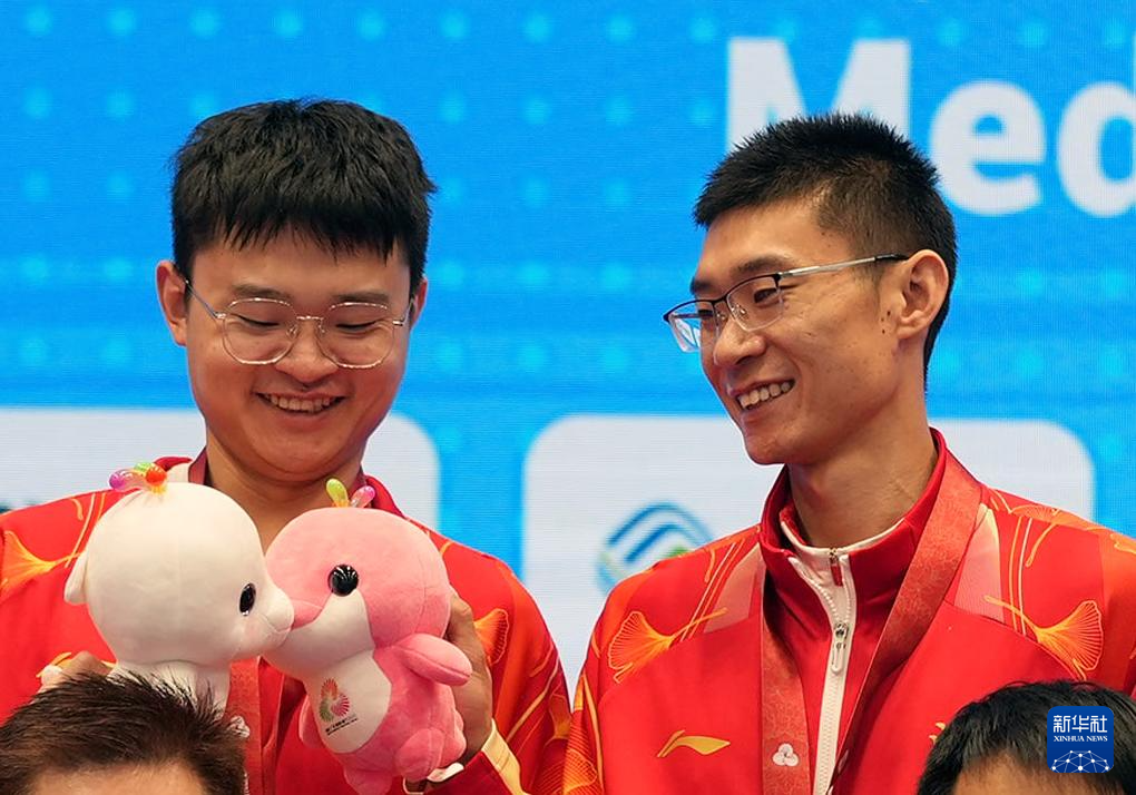 12月12日,亚军江苏队选手刘宇(左)和冠军苏沪联合队选手仲赛春在颁奖仪式上互动。