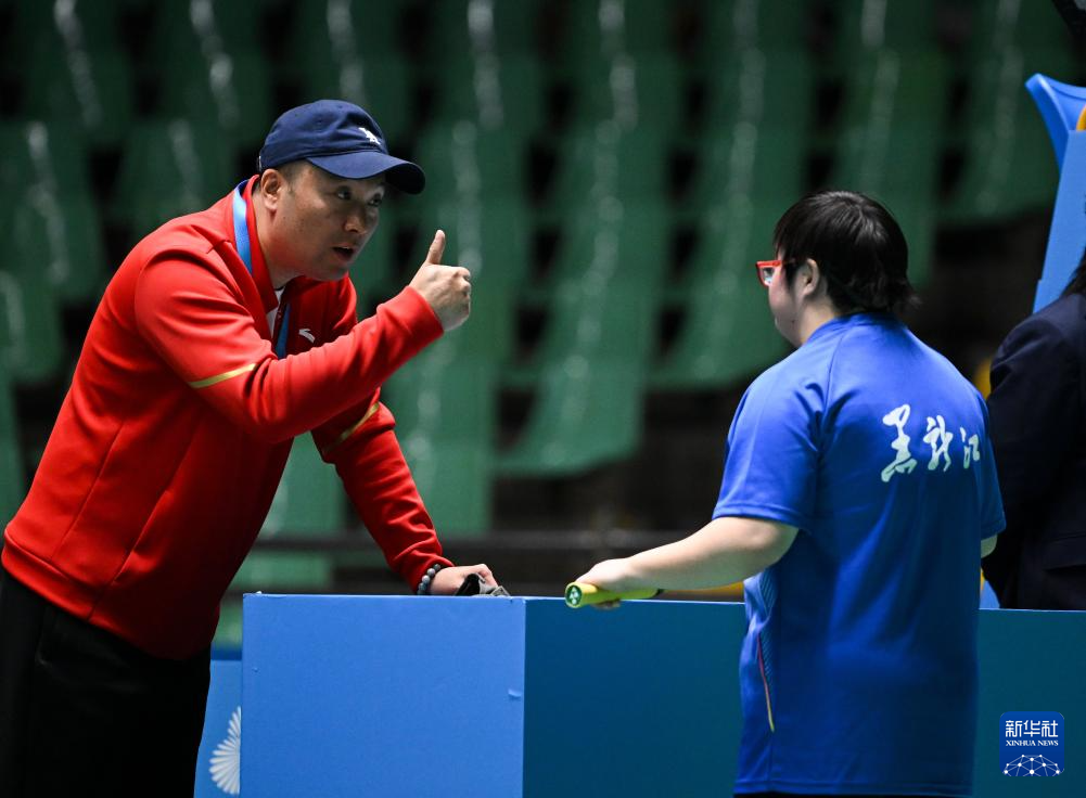 12月14日,黑龙江队教练李超在场边指导队员李百明。在女子22-29岁组单打B组第5场比赛中,她2比0战胜甘肃队选手饶佩玉,获得冠军。