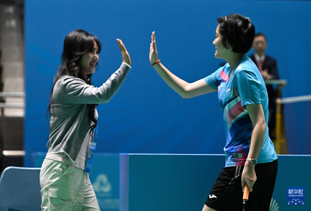 12月14日,甘肃队选手李鑫宇(右)在女子22-29岁组单打B组第6场比赛后和甘肃队领队包薇击掌庆祝。她2比0战胜北京队选手赵欣婷,获得季军。
