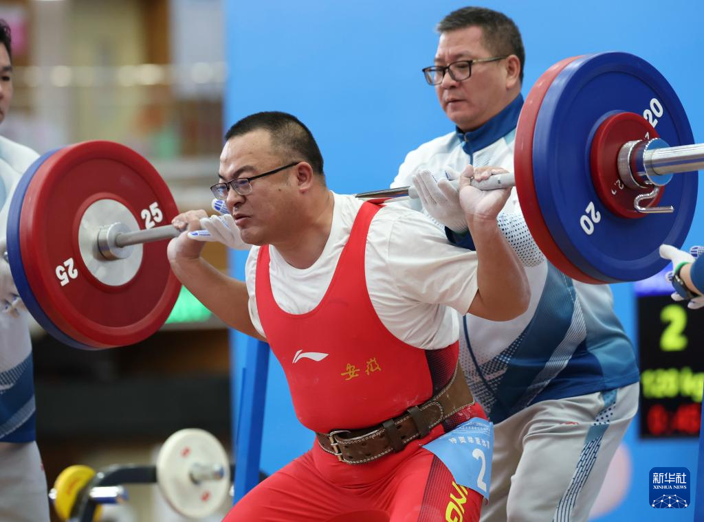 12月14日,江西队选手杨广文在男子22岁以上组82.5公斤深蹲决赛中。他获得该级别冠军。