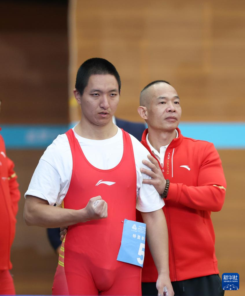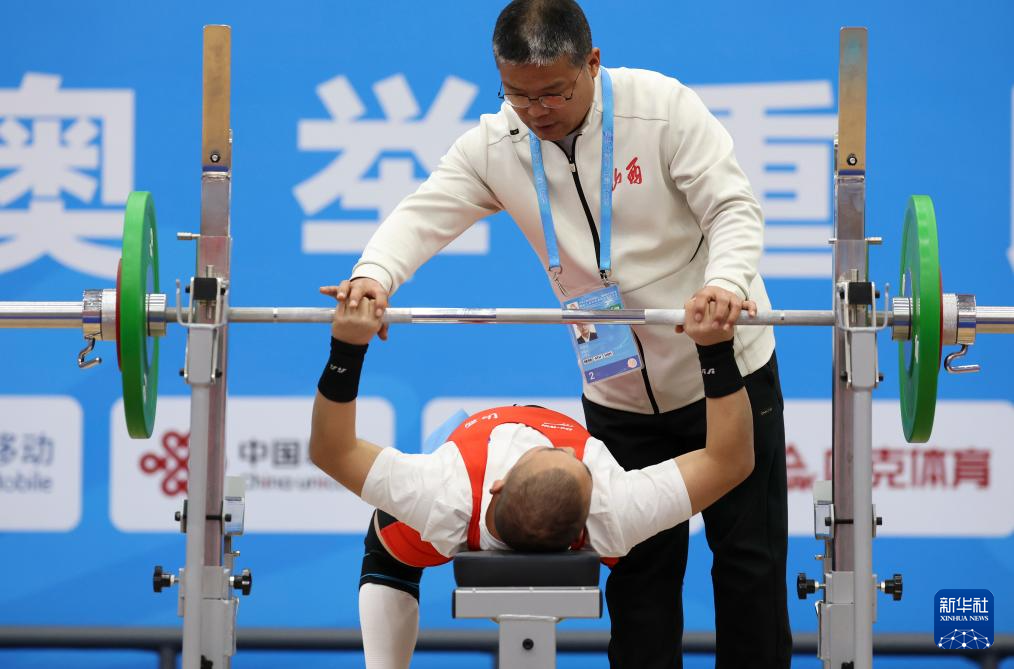 12月14日,山西队教练为在男子22岁以上组75公斤卧推决赛中为选手郭鹏强调整姿势。他获得该级别亚军。