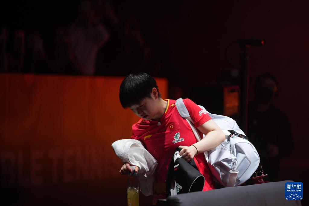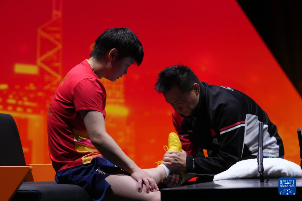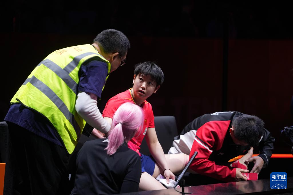 12月13日,孙颖莎(中)在比赛中接受治疗。