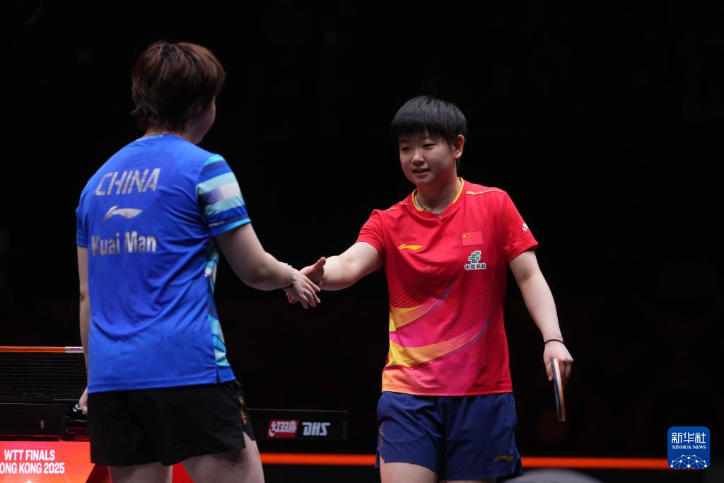 12月13日,孙颖莎(右)在比赛后与蒯曼握手致意。