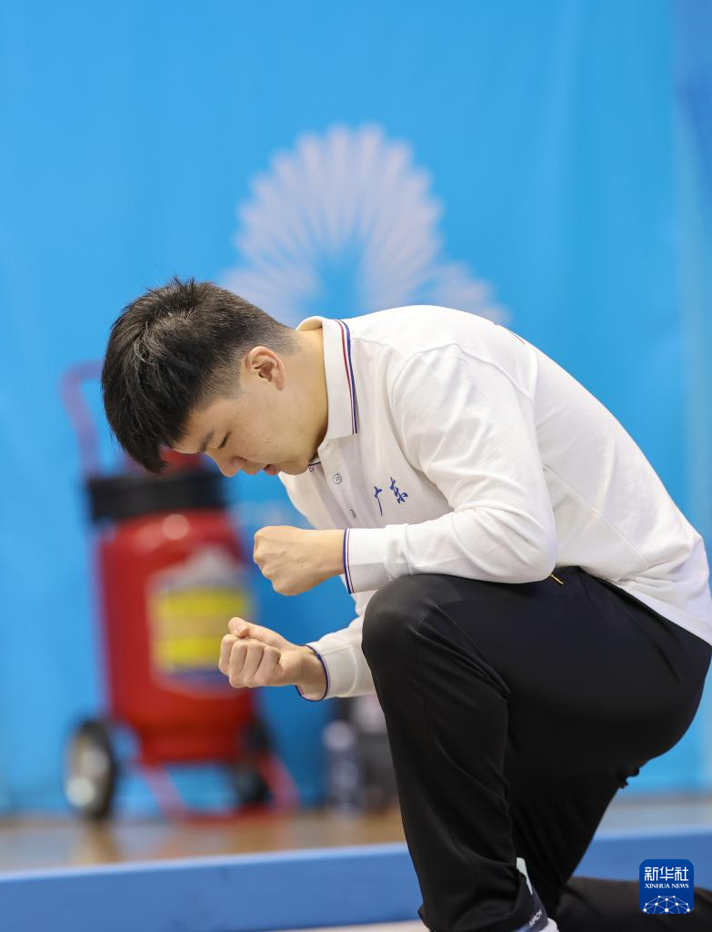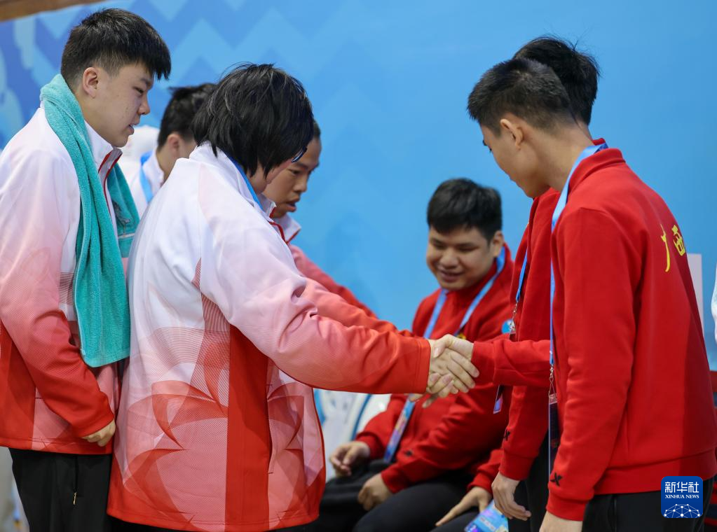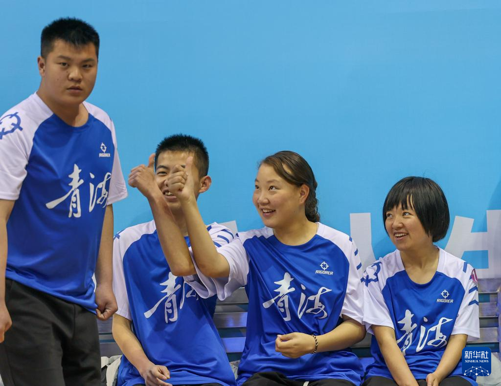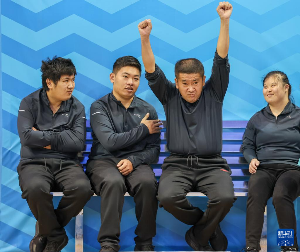 12月14日,青海队选手宋子言(左二)、额尔德尼曹(右二)为队友常坤点赞。青海队获得22-29岁组混合团体赛A组第四名。