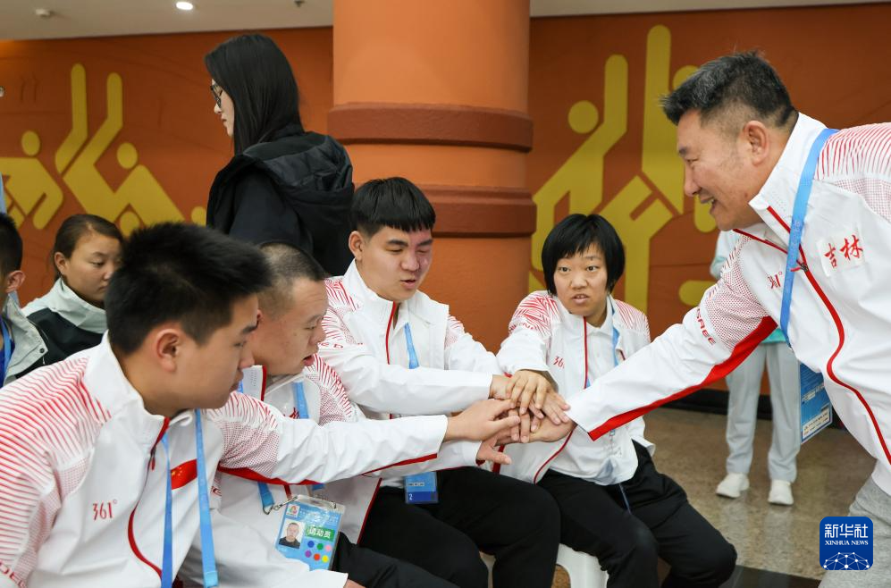 12月14日,吉林队教练员(右一)和运动员们在赛前加油鼓劲。吉林队获得22-29岁组混合团体赛A组冠军。