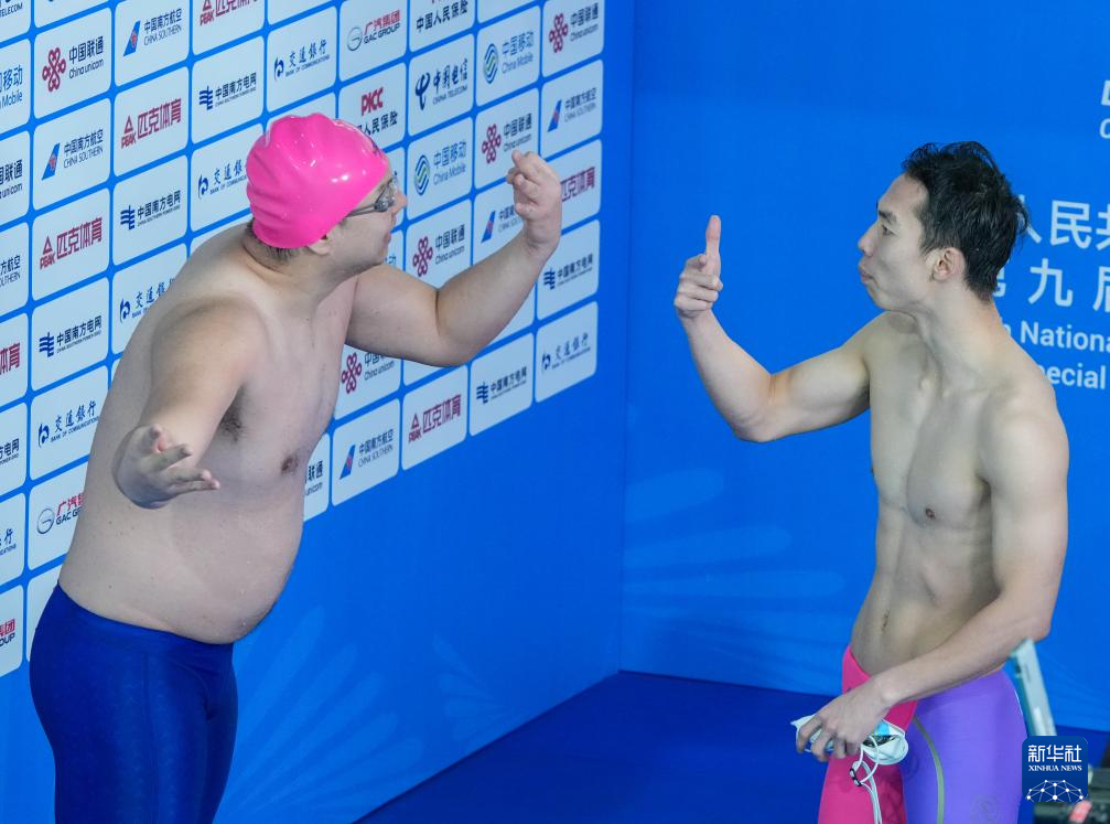12月14日,浙江队选手汪子翔(左)与广西队选手陆立权在男子100米蛙泳SB15预赛第1组赛后用手语交流。他们晋级决赛。