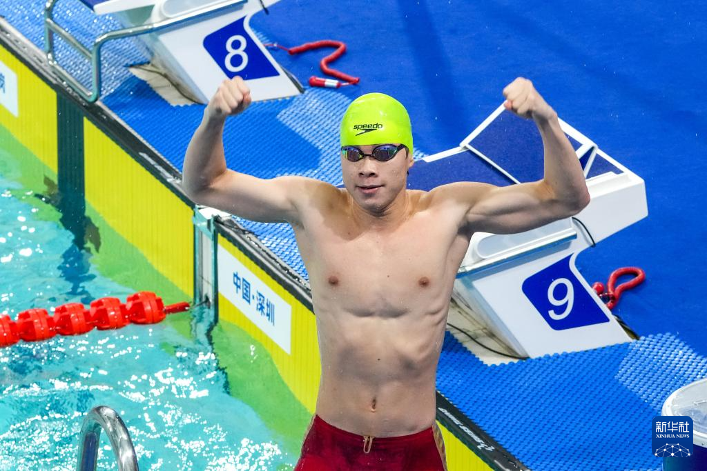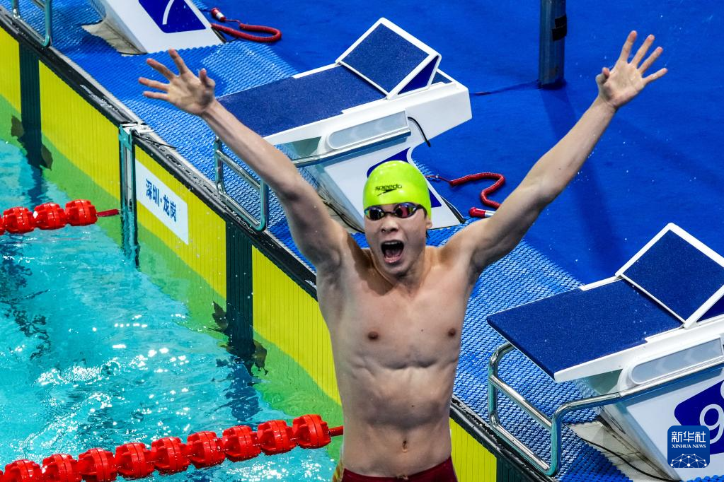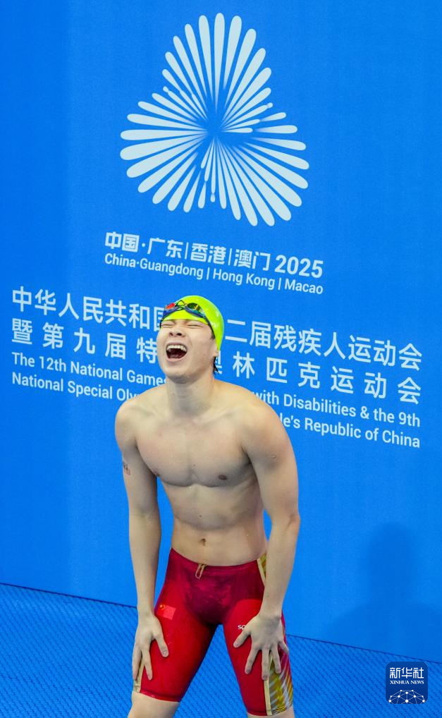 12月14日,广东一团队选手黄学亮在男子200米个人混合泳SM13决赛后庆祝夺冠。