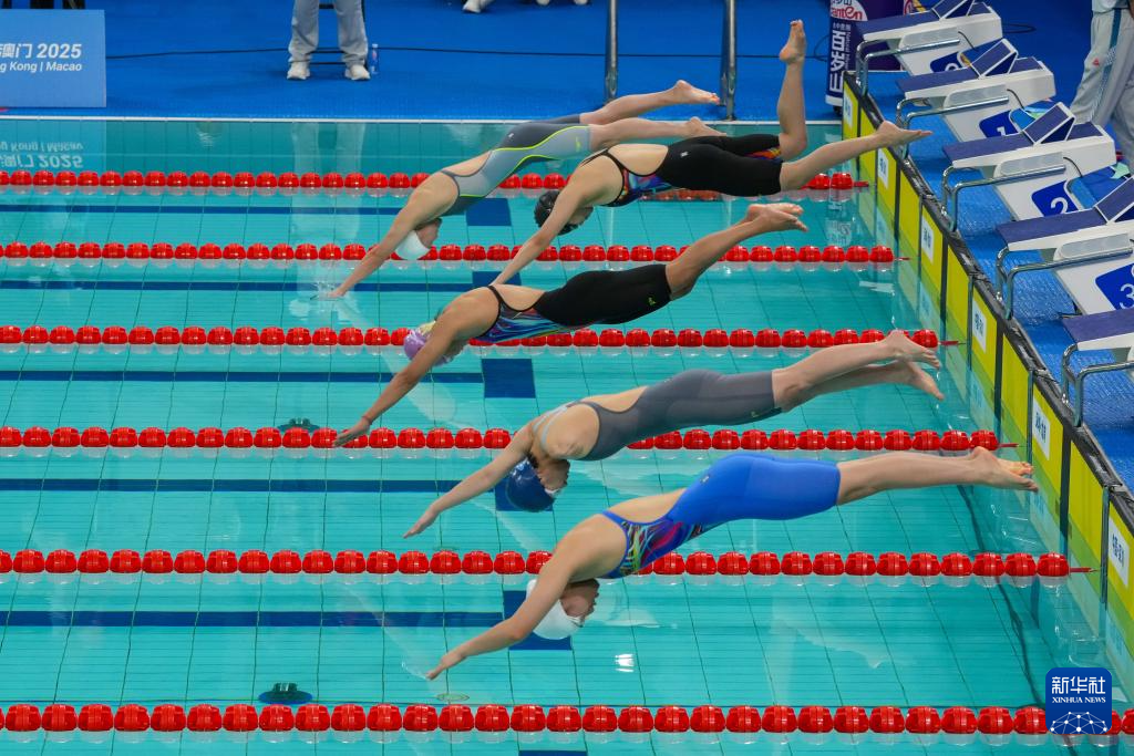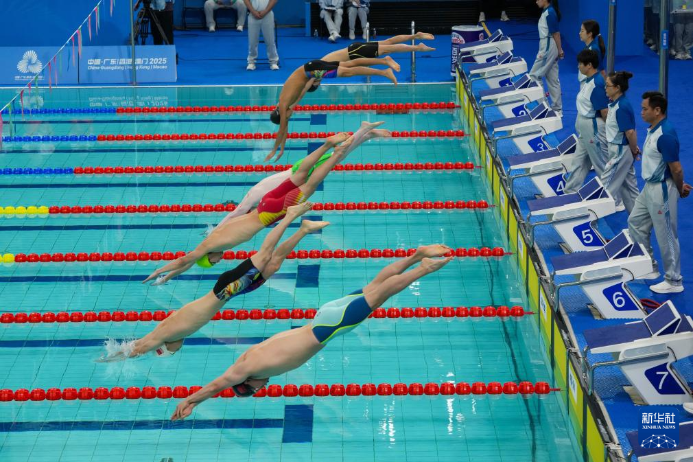 12月14日,在女子100米蝶泳S8决赛中,选手们跃入泳道。