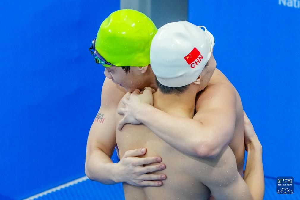 12月14日,在男子200米个人混合泳SM13决赛后,广东一团队选手黄学亮(左)与湖南队选手刘鹏思拥抱。他们分获冠军、亚军。